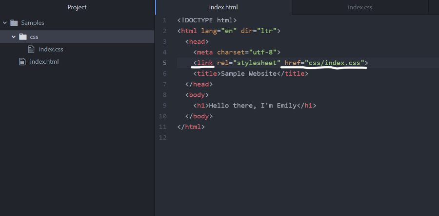 The ‘link’ tag in red signifies a link, ‘href’ is the source, the ‘css’ is the folder, and the ‘index.css’ is the stylesheet itself. This tells the computer where to find the stylesheet so it can be applied.